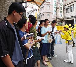在游行中,民众对法轮大法真相材料的接受度很高,对学员们所发的莲花书签更是爱不释手,有人已经拿了还掉头回来想再多拿一朵;另有很多民众赶紧自备相机,一一按下快门;也有民众当场表示想学炼法轮功,并询问金门的炼功点等。