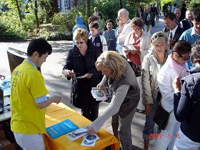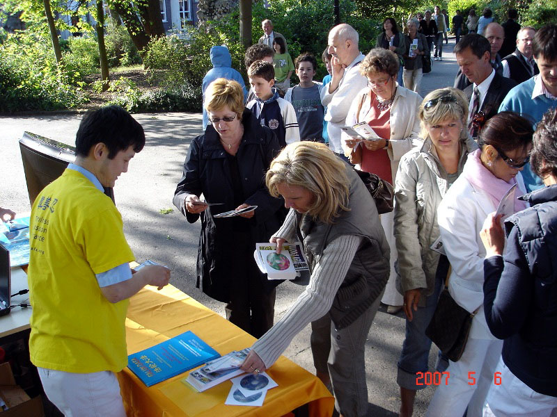 同时法轮功学员也通过在街上设立信息摊位,向路人发送真相材料,用真人模拟演示法轮功学员所遭受的酷刑折磨等形式向比利时的民众讲真相。有不少比利时人是在迫害开始后修炼法轮功的。