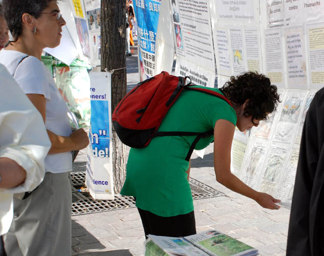 【明慧网二零零七年九月十三日】二零零七年九月八日星期六,法国法轮功学员在巴黎繁华的商业中心Chatelet les Halls旁的无辜者泉水广场(Place de la Fontaine des Innocents),用图片展、散发真相传单等方式,向当地民众和行人揭露中共