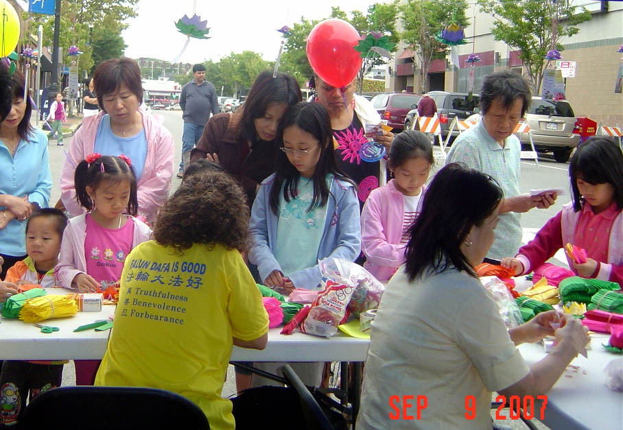 ![]() 民众围着法轮功学员的摊位学做莲花、听大法真相。 |