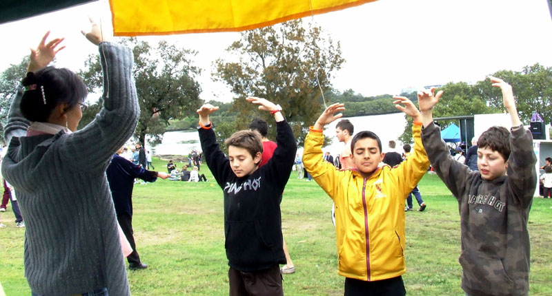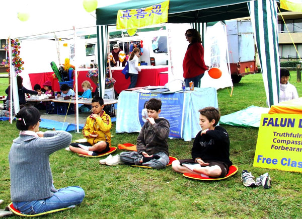 人们纷纷到法轮功学员的摊位拿资料,并签名声援反迫害。有趣的是,一大早,三位前几年来学过功的小朋友,又来到摊位。其中一位小孩的爸爸也来了,他说去年他儿子学完法轮功后,就回家与他分享炼功的感受。这三位小朋友再一次兴高采烈的学炼功法,并表示下午再来。