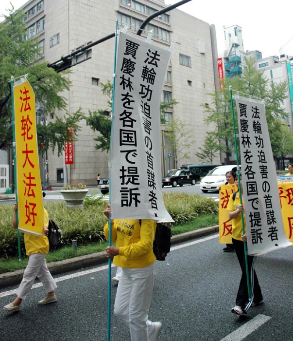 两位日本的法轮功学员(中国人和日本人各一名)对于在中国北京及大连期间所遭受的非法拷问、暴力洗脑和监禁及长期劳教,以及中共驻日大使馆网站上公开发表的对于法轮功学员的人格诋毁,基于对群体灭绝罪所享有的国际管辖权,对于被告贾庆林以及薄熙来提出控告并要求赔偿三千万元日币(逾二十六万美金)。