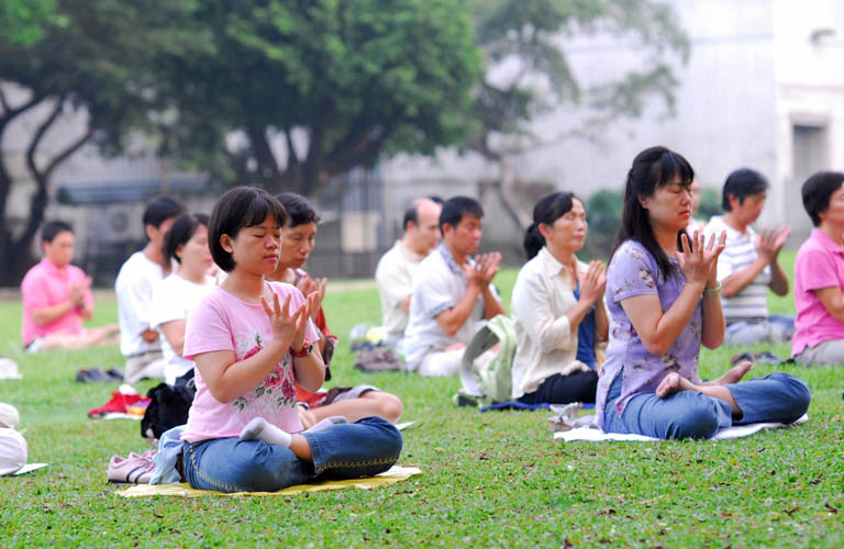 贵州法轮功学员在心得交流会期间集体炼功。