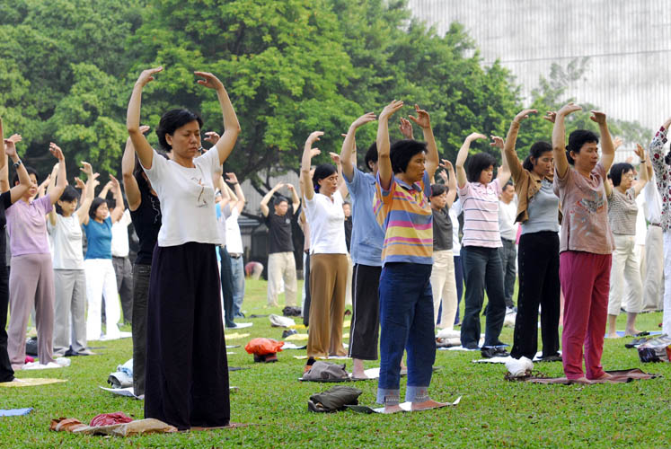 一九九八年在广州一个法轮功炼功点学员们在晨炼。