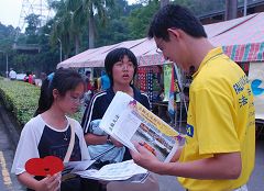 ![]() 嘉义大学的新生接到简介时,向学员询问大法真相。 |