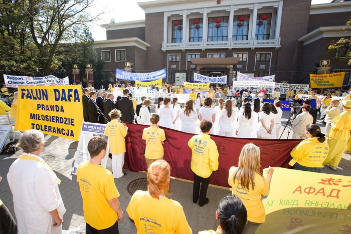 二零零七年九月二十二日清晨,数百名来自欧洲二十八个国家的部份法轮功学员,聚集在华沙市中心科学文化宫前的德菲拉德广场集体炼功。他们在广场上安详的打坐,整齐的排列出中文“正法”二字,整个广场被一股宁静、安详的气氛包围着。往来的路人不时驻足观看,并接过学员递上的真相资料和《九评共产党》。欧洲《为你而来》合唱团也前来助兴,给华沙人民带来了三首保留歌曲。