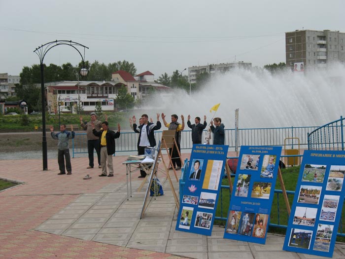 二零零七年六月末,俄罗斯哈卡西(Khakassia)自治区的首府阿巴干(Abakan)市法轮功学员和部份其他俄罗斯学员们在市中心的喷泉公园進行了本市的第一次大型集体洪法讲真相活动。