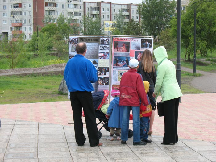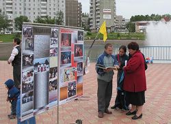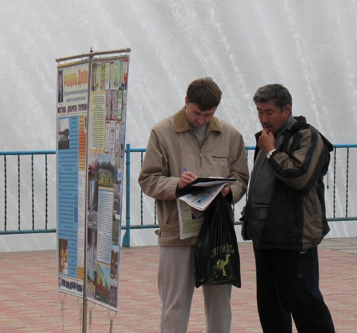 有意思的是在阿巴干的上一次小型洪法讲真相活动中,按照俄罗斯法律,当地的警察有责任在这样的活动中在场维持秩序以免有什么不良之徒或者酒鬼在场滋事,因此有不为数不少的警察一直在场到活动结束。而这一次,规模和人数都较上一次大且多,还有数个城市前来的法轮功学员,但维持秩序的警察却一个也没来。据阿巴干法轮功学员讲,因为上一次活动从头到尾平和安详,井然有序,学员静静的炼功、平和的向世人讲真相,热情礼貌的散发资料,向世人也向前来维持秩序的警察们展示了法轮大法的祥和和美好;世人也同样安静礼貌,有兴趣的就上前观看大型的图文并茂的展板,再有的就提出一些问题;有的当场就试着和学员一起学着炼起功来,还有的当场就索要书籍和资料要回家進行研读。警察们觉的确实没有必要再来维持什么,也就干脆不来了。