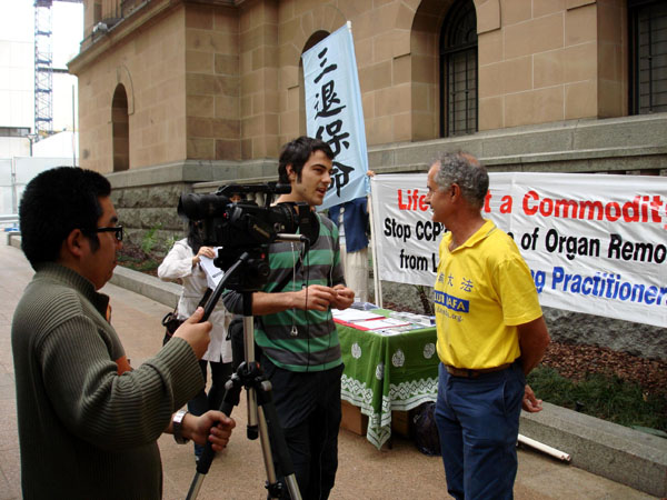 西人法轮功学员大卫表示:「我们在布里斯本市政厅外面,以横幅来传达讯息,告诉亚太地区的贵宾,中共对法轮功的迫害已经持续八年了。」