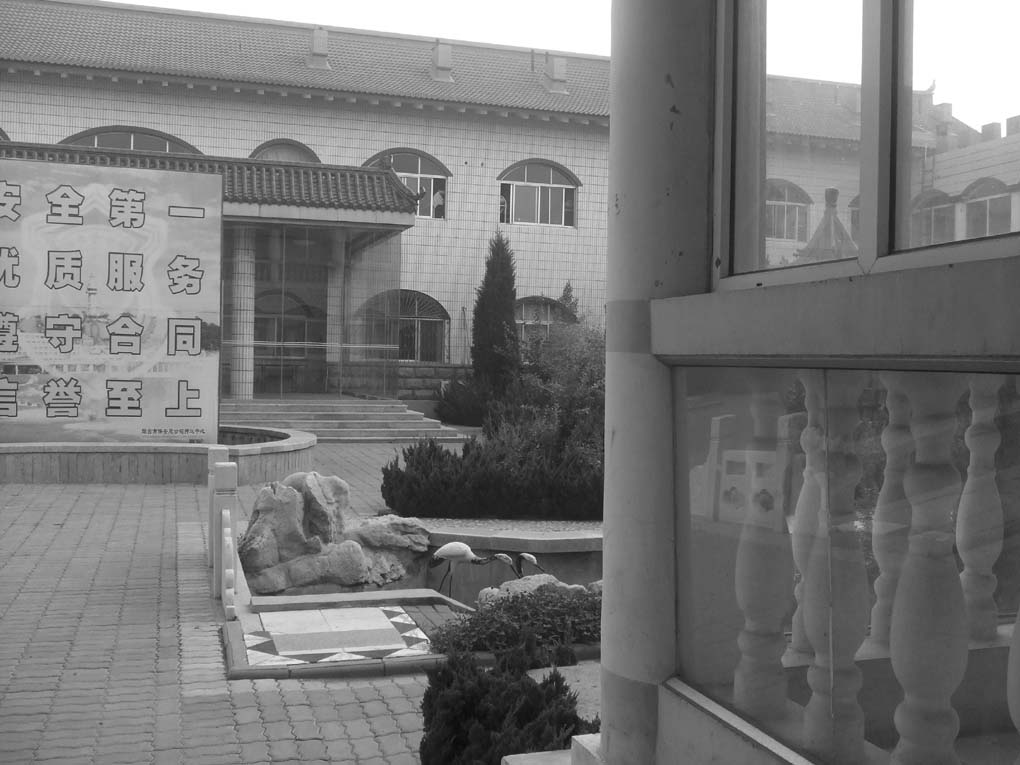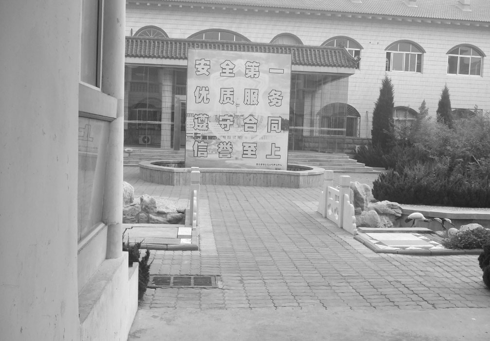 ![]() 押运中心四面是二层高的尖角楼,进门向右拐在底楼关押着大法弟子,楼上住着武装押运的保安员 | ![]() 这是正门,冲着门口有一个大牌子,牌子后面掩盖着罪恶 |