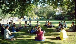 ![]() 法轮功学员在摄政公园炼功、发正念。 在炼功的人群中,包括当场跟学员们认真学起功法来的路人。 |