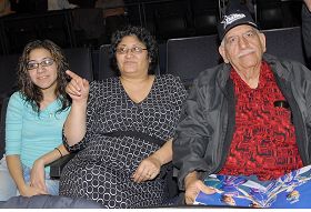 若瑞盖斯一家从网络上得到新唐人华人新年晚会在达拉斯演出的消息,三口人:爷爷Jose、妈妈Esmeralda、孙女Melissa就购票决定去观看。