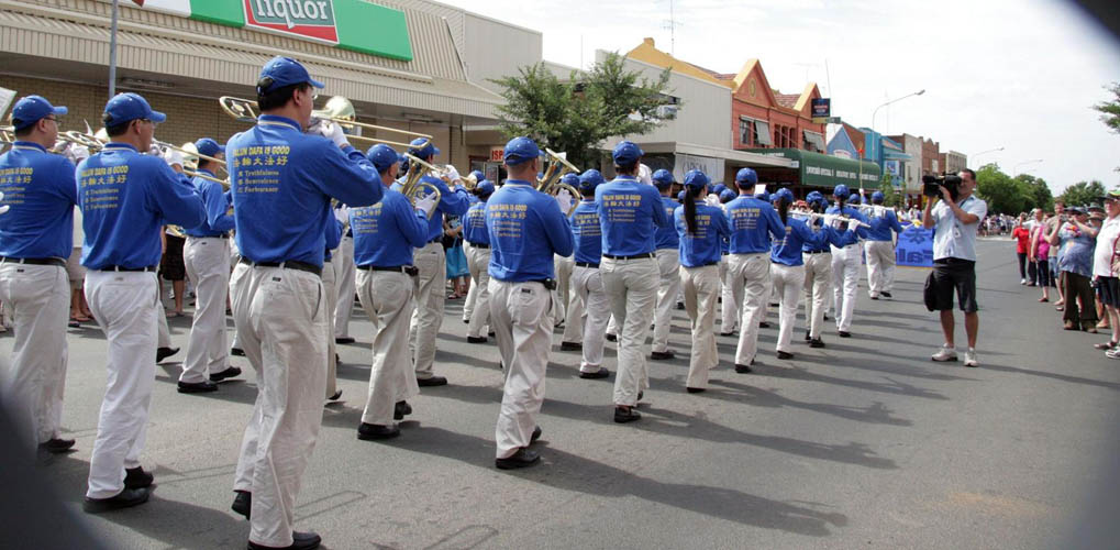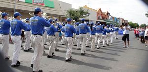 法轮功的天国军乐团气势磅礴,声势浩荡,身着金黄色炼功服的腰鼓队、手托莲花的唐装仙女也给游行的队伍中注入了一股高雅、纯净的清流。法轮功队伍所到之处,扫尽笼罩在街道上空的阴霾和迷雾。街道两旁的观众看到法轮功队伍非常兴奋,不断的欢呼、喝彩、拍照。