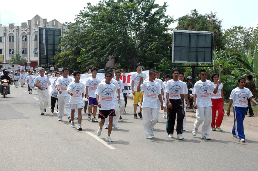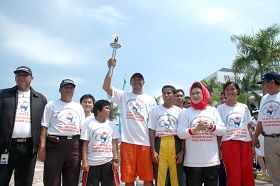 ![]() 丽耀(Riau)群岛首长夫人将人权圣火火焰交给田径队伍代表 |