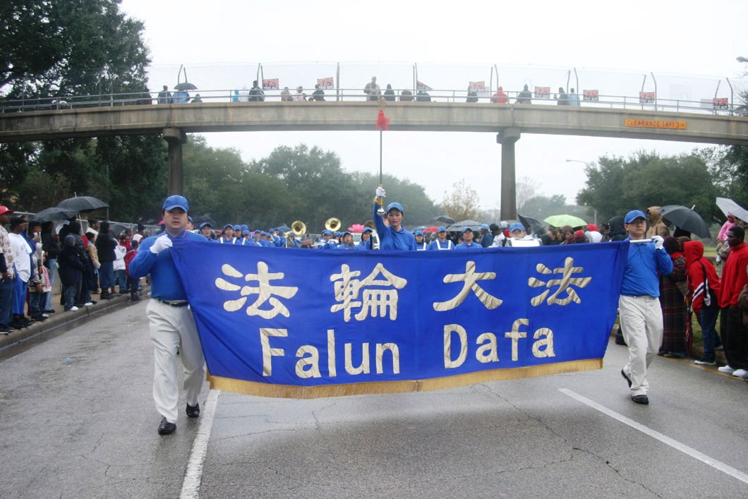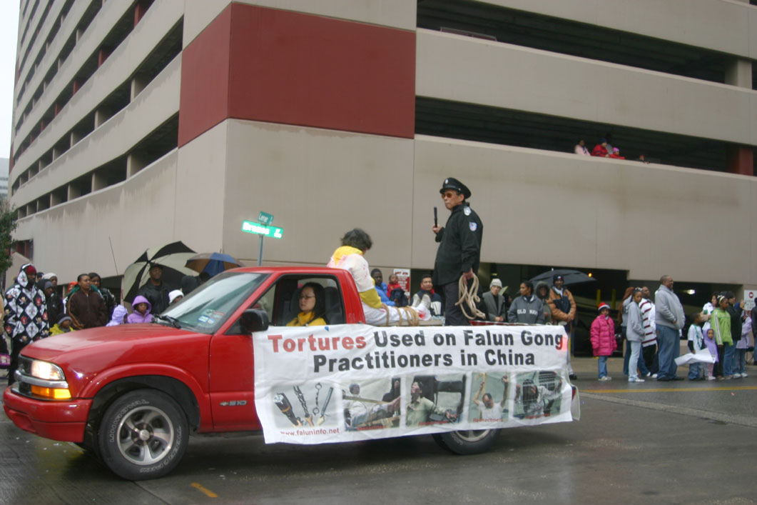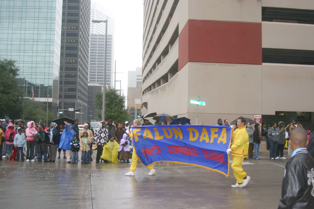 游行从Allen Parkway(与Montrose交界)起步,绕市中心两圈,约一点五英里。尽管活动期间细雨绵绵,沿着游行路线仍布满了观众。当法轮功队伍的“法轮大法”横幅一出现,马上就有一些观众高呼:“法轮大法”。由德州法轮功学员组成的天国乐团,是首次在马丁·路德·金大游行中亮相,他们神采奕奕,格外引人注目。花车上身着黄色炼功服或身着唐装的法轮功学员展示着功法,“缓、慢、圆”的动作吸引着观众。录影机,照像机都聚焦法轮功队伍。而“揭露中共迫害”的反酷刑展(模拟展示)更引人注目,两侧横幅“酷刑正在中国发生”震撼着观众的心。如此平和美好的功法却在中国受到打压,许多观众都表示不可思议,纷纷索取资料了解更多详情。