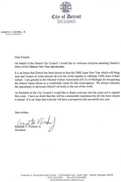底特律市议会主席肯尼斯•V•考克雷尔(Kenneth Cockrel)在贺信中表示:“在底特律市举办二零零八年华人新年晚会并庆祝具有五千年悠久历史的中华文化是底特律市的荣耀。我对东方文化协会选择在底特律歌剧院举办这台高水平晚会深表谢意。”“作为市议会主席,我谨向支持和来欣赏这台晚会的每一位嘉宾表示感谢。毫无疑问,每一位欣赏新年晚会的朋友将会留下难忘的记忆。祝朋友们新年发达和成功。”