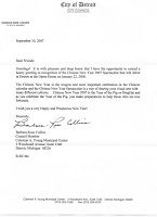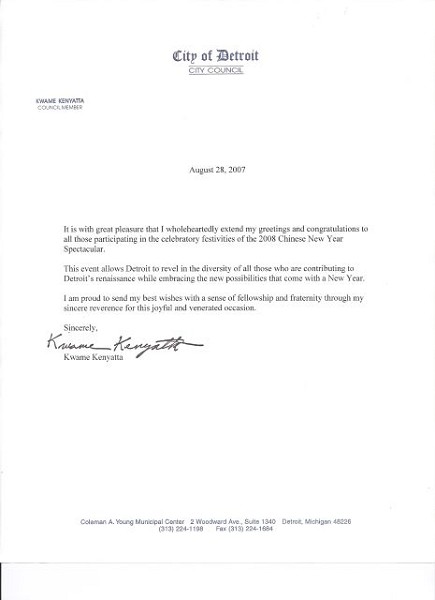 ![]() 底特律市长科威明•基派崔克(Kwame Kilaptrick)的贺信 |