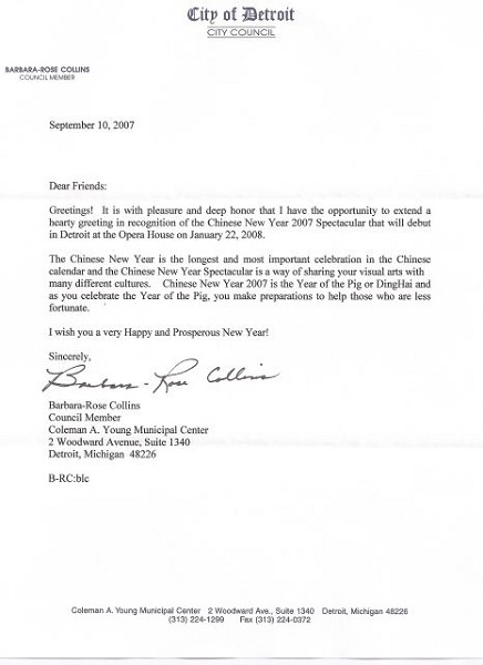 底特律市议会议员芭芭拉•罗丝•考琳斯(Barbara Rose Collins)在贺信中表示“能有机会恭贺二零零八年华人新年晚会于二零零八年一月二十二日在底特律歌剧院隆重演出,深感荣幸和欣慰。”她说:“中国新年是华人最重要的节日,具有悠久的历史。华人新年晚会是与其他族裔分享中华文化艺术的一种有效途径。二零零八年是农历鼠年。在庆祝鼠年到来之际,华人新年晚会将为人们带来好运。”