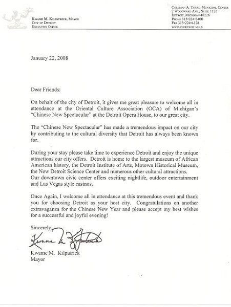 底特律市长科威明•基派崔克( Kwame Kilaptrick)在贺信中表示他代表底特律市非常荣幸的欢迎 “全球华人新年晚会”在底特律歌剧院举行。信中说:“‘全球华人新年晚会’借着多元文化的传递带给底特律市巨大的震撼,就如同底特律市长久以来被大众所认同的一般。”