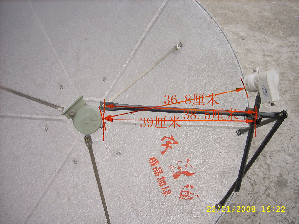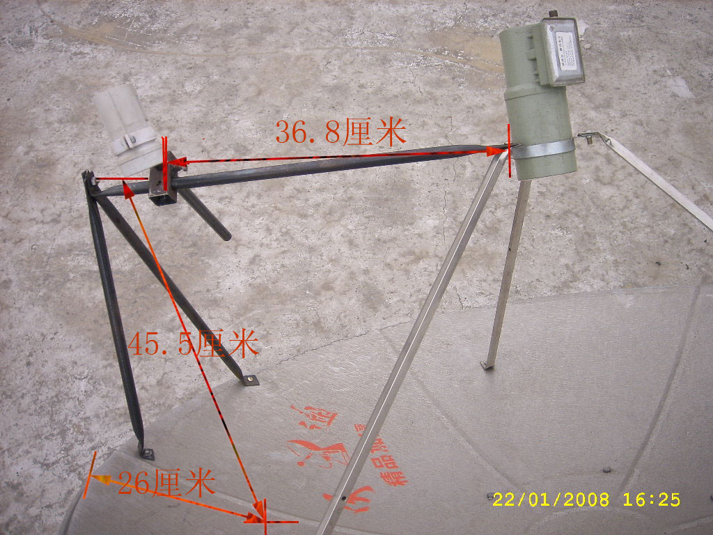 从大锅后边看各个部件的距离:单本振频头到锅面的垂直距离为44厘米(图一);从单本振频头的左侧到双本振频头右侧的头部边缘距离大概为36.8厘米,从高频头左侧边缘按高频头延伸的方向到锅的距离大概为45.5厘米从锅的外边缘到顺高频头方向延伸与锅面交接点到大锅外边缘距离为26厘米左右(图二);从单本振频头的左侧到固定双本振频头的不锈钢钢管中线平行方向的距离为39厘米,从固定不锈钢钢管的螺丝中央到固定高频头的不锈钢管中间距离为38.5厘米(图三)。