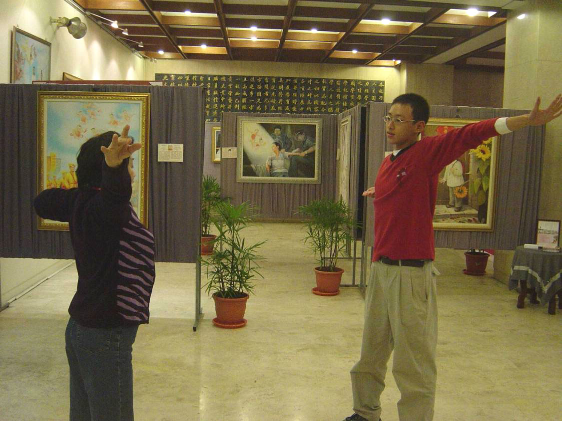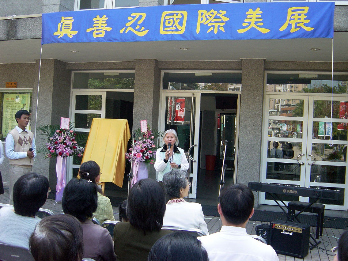 十七日中午画展开幕,文山区公所主任秘书白女士应邀致词,她表示此次画展充份展现出法轮功学员“真、善、忍”的和平精神,让民众有机会观赏到美丽的画展、陶冶身心;但这么好的功法却在中国大陆遭受残酷镇压,也希望来赏画的民众能共同关心受迫害的法轮功学员。学校课外活动组千惠老师致词时表示,政大法轮功研究社虽然人不多,但仍积极的办了许多大型活动,精神可佩。在法轮功学员优美的歌声中,开幕式圆满结束。
