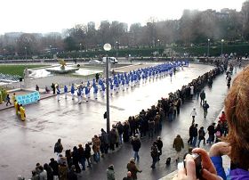 法轮大法的队伍是第一个出场的团体,参加的人数最多,也是唯一一支以华人为主的受邀团体,共有四个表演内容:上百人编制的欧洲天国乐团、扇子舞、法轮功功法表演和唐装表演。队伍气势宏大,色彩绚丽。