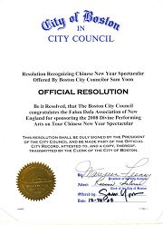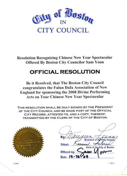 波士顿市议会在此褒奖新英格兰地区法轮大法学会恭贺二零零八年神韵巡回艺术团全球华人新年晚会成功。