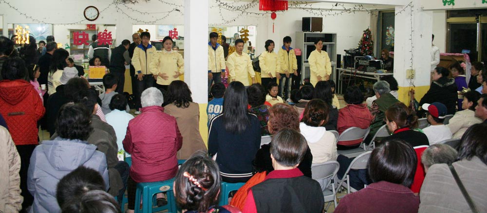 会场备有茶点,加上邻居见面真是热闹。节目准时开始,原本热闹、有点混乱的场面,当功法演示开始时,炼功音乐一响起,全场很快静下来,大家安静的看着法轮功五套功法演示。每套功法演示之间由一位学员穿插介绍功法、指导人修炼的《转法轮》一书、和法轮大法“真、善、忍”的原则。