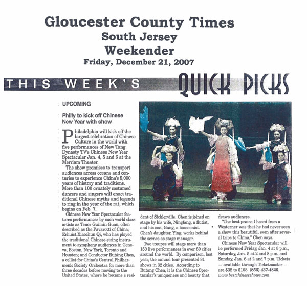 南新泽西的格罗切斯特郡(Gloucester)时报在其十二月二十一日的推荐娱乐版报导说,费城将以新唐人电视台的“全球华人新年晚会”揭开全世界最大的中国文化的庆典,一月四、五、六日晚在费城美丽安剧院进行演出。
