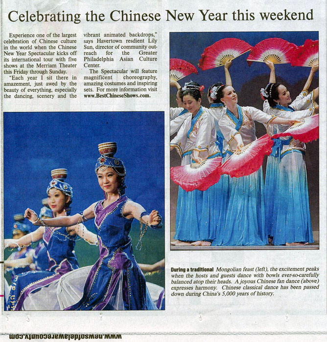 德拉华郡新闻报还以大幅彩色图片刊登了往年演出的蒙古顶碗舞和传统的、象征和谐的扇子舞。报导说,中国古典舞蹈历代相传,有五千年的历史。