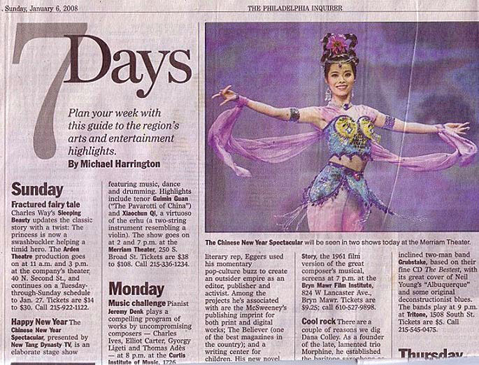 【明慧网二零零八年一月七日】新唐人电视台全球华人新年晚会之世界巡回演出一月四日晚在费城美丽安剧院(Merriam Theater)正式开场。大费城周边地区的报纸纷纷报导这一三州地区最大的中国新年庆典。费城最大的英文报纸《费城问询者报》曾以“美丽安剧院的舞台提前迎接鼠年 - 全球华人新年晚会!”为题,报导晚会的盛况。