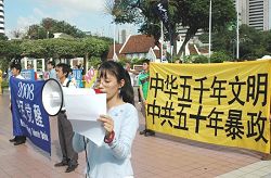 最后游行队伍抵达独立广场进行声援退党活动集会。退党服务中心发言人陈劲女士宣读退党中心的新年公告。她呼吁大家一起帮助广传《九评》,退党自救。