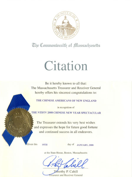 麻萨诸塞州财务部长在此最诚挚的祝贺新英格兰地区的华人,祝贺2008年新唐人华人新年晚会。