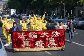 二零零八年九月二十六日至二十八日,连续三天,欧洲部份法轮功学员在法国巴黎举行集会游行,抗议欧卫中断新唐人信号,呼吁制止对法轮功的迫害。