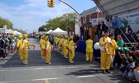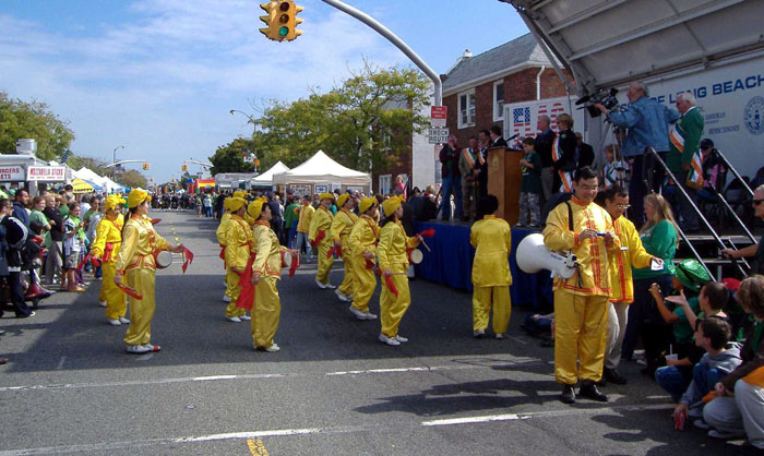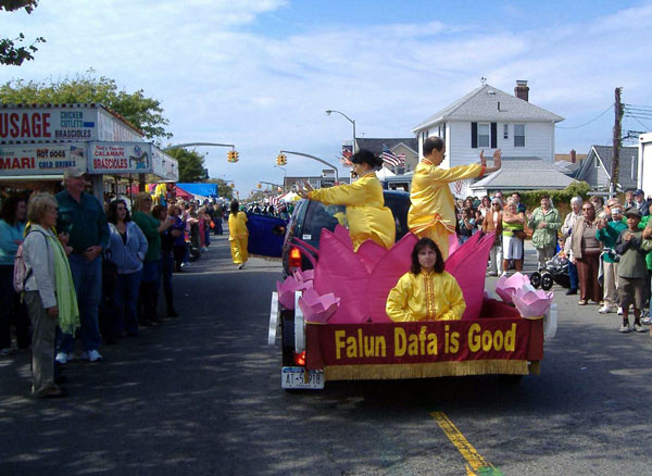 走在最前头的学员手举“法轮大法”横幅,在“普度”音乐声中向长沙滩市的人们走来。许多人举起了相机拍照,留下这难忘的瞬间。很多观众为法轮大法游行队伍鼓掌,还有许多人大声赞叹:太美了,太好了!国会议员Peter King及当地的政府官员们都观看了游行。