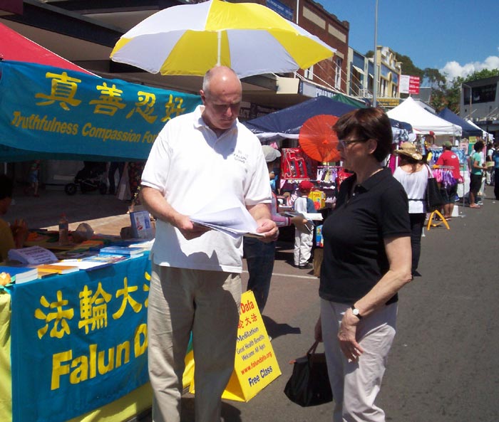 法轮功学员在人流如潮、热闹喜庆的集市上设置真相摊位,演示五套功法。他们在展示法轮大法祥和美好的同时,揭露九年多来中共对法轮功修炼者的残酷迫害。“法轮大法好”、“真善忍好”的横幅在阳光下闪闪发光,人们在“普度”音乐声中不断向法轮功摊位走来。