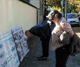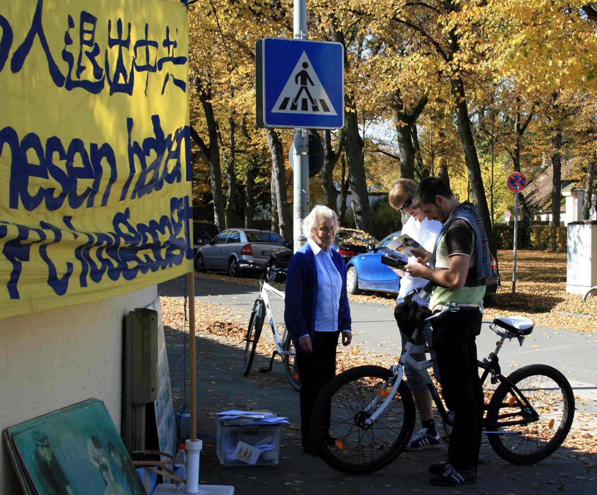 秋日的慕尼黑气候十分宜人,树叶都开始转为红黄色,在蓝天的映衬下非常美丽壮观,这样的好天气自然吸引大量游人。人们成群结队的来到著名景点纽芬堡王宫游玩。当他们路过附近的中领馆时,不少人都被法轮功学员祥和的炼功场景、横幅与图片展板所吸引。在仔细观看了揭露中共迫害的展板之后,一位老年妇女流下了眼泪,亦有人被炼功的音乐打动,其中不少人签名声援法轮功学员。