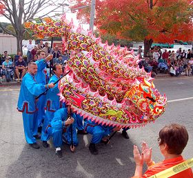 ![]() 法轮功学员组成的舞龙队,表演活灵活现,观众高兴地鼓掌。 |
