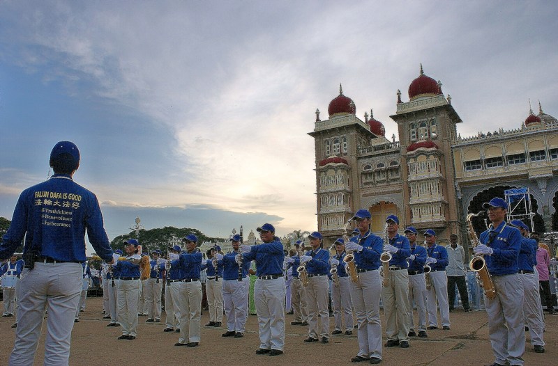 于下午时段,亚太天国乐团受邀到迈索尔皇宫前为广大民众表演。当天国乐团踏着整齐的步伐途经繁忙的马路时,吸引了群众的注意。人们纷纷停下脚步和汽车索取大法的真相资料。沿途的观众反应热烈,很多人看到法轮大法亚太天国乐团及腰鼓队经过时,都鼓掌欢呼,竖起大拇指叫“法轮大法好”。