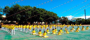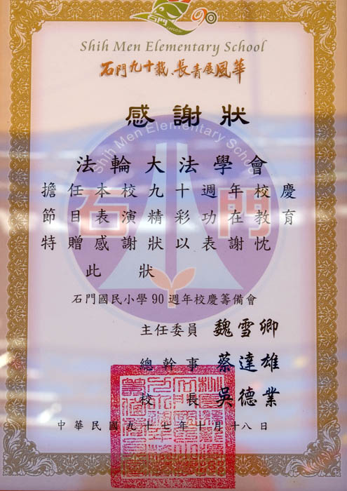 今年的校庆,特邀法轮功学员来学校表演。约一百三十位的学员演示功法,动作整齐划一,其中还不乏年纪小的学生,也包括黄主任的儿子及在北势国小任教的妻子。