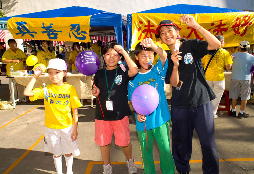 ![]() 获得书签的小学生和法轮功学员小朋友合影 |