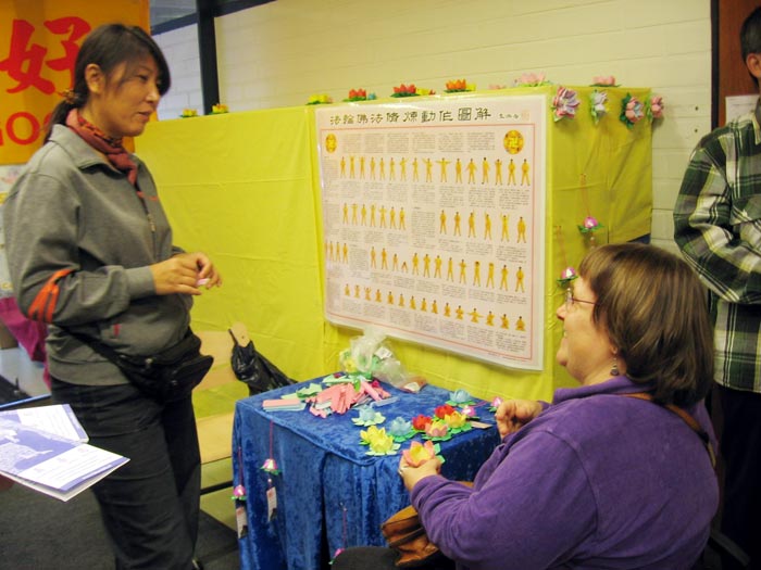 摊位上高悬着金黄色的“法轮大法好”横幅;法轮功学员伴着优美的炼功音乐,演示五套功法;桌上摆放着《法轮功》、《转法轮》等书籍及各种洪法讲真相资料。观众来时,学员们送上真相传单,还不时的递上一朵纸莲花,把法轮大法的美好和祝福带给人们。桌上还摆有征签簿,呼吁制止中共对法轮功的残酷迫害。前来参观的很多人主动签名。