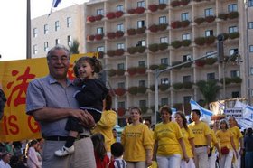 虽然游行安排在下午,但上午公园里就聚集了成千上万的人,其中包括很多专门来以色列参加节日庆祝活动的外国游客。大法弟子们摆出了真相展板,集体炼功,希望有更多人能了解法轮功真相。人流不断的来到大法弟子旁边,人们在得知中共邪党迫害法轮功学员的事实后,纷纷在征签簿上签名,声援法轮功学员的反迫害行动。