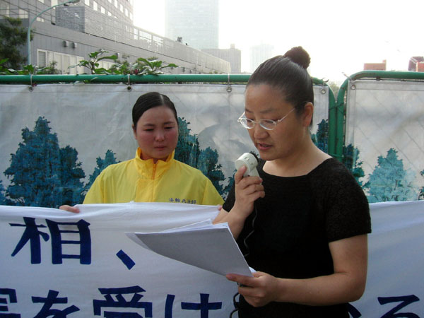 NPO法人日本法轮大法学会鹤园雅章代表在发言中指出,中国正在发生各种严重的人权迫害问题。在这些人权迫害中,对法轮功修炼团体的迫害最为厉害和残酷,希望首相麻生此次中国行,能把法轮功学员要求停止迫害的呼声带到中国。
