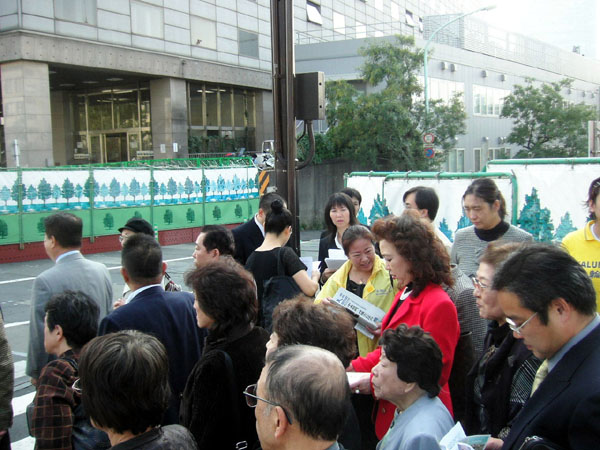 ![]() 在此经过的日本议员和各地到国会来的人们纷纷接受法轮功弟子的真相传单、并阅读。 |
