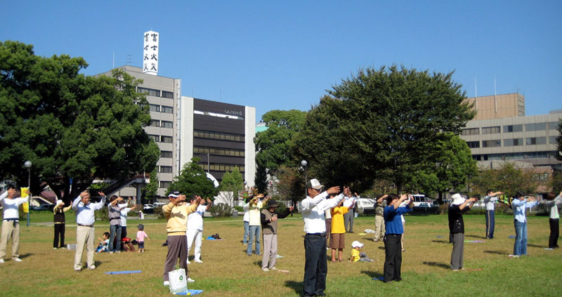 十月的熊本正是晴空万里的秋季,十九日天气格外轻爽,上午十点,前来参加法会的法轮功学员在白川公园集体炼功。炼功场的两侧高挂法轮大法的旗帜;而面向人行道,则整齐摆放了介绍了法轮功在世界各地的洪传以及在熊本普及的真相展板。另外, 学员还准备了揭露了中共对法轮功的残酷迫害的真相资料。