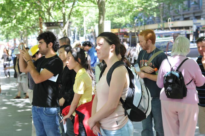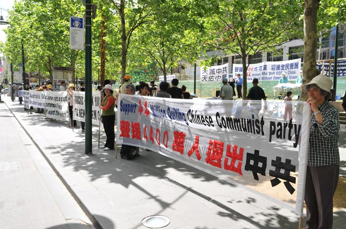正值南半球春光明媚,踏青、游玩的人络绎不绝。在位于市中心枢纽Swanston大街的城市广场上,几十条大型横幅向民众传递着退党大潮的信息,真相展板通过一幅幅真实的历史照片,揭示了中共执政以来的一系列暴政,迫害死八千万无辜百姓,尤其是对法轮功修炼者的迫害更是令人发指。集会现场吸引了不少行人的注目,他们或停下脚步、仔细阅读展板上的内容,或聆听集会演讲,或与散发资料的退党义工们交谈。