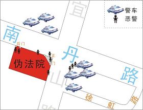 上海的邪恶之徒心虚害怕至极,出动大批警察层层设防。在法庭外围的穿制服的警察有30多名,另有很多便衣特务游走窥探行人车辆,连街角的茶楼里都坐了便衣特务。有知情者讲:这次出动了80多名警察。现场的警车在两个多小时时间都没熄火,车中开着空调,每辆车中都有人。