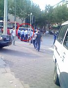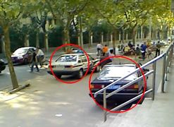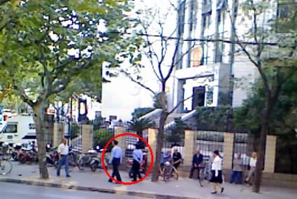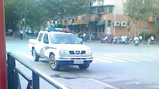![]() 在法院马路对面的警车和法院正门口的警察及和他说话的三名便衣(2男1女) | ![]() 在南丹路宜山路绕法院往返巡逻的恶警 |