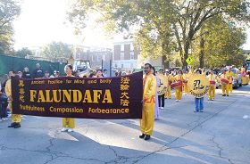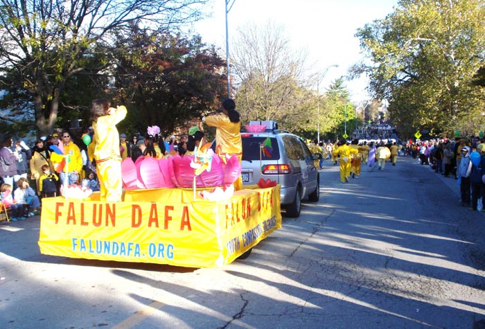 八点半游行开始,之前还能看到东南边的天空有一片铅云,此时已是阳光普照。法轮功学员的队伍九点整正式步入行进行列中。迎面首先看到的是紫底金字的“法轮大法”横幅,后面两名仙女手持圣洁莲花笑意盈盈,接下来,三名神采奕奕的老年学员一人手拿一个牌匾,上面写着“真”、“善”、“忍”,愿每一位有缘人都能认得他。再接着是威风神气的唐鼓队,最后是装饰精美的花车,小弟子和成年学员一起向人们展示法轮功柔美舒缓的功法。花车边的英文“法轮大法”几个字在灿烂的阳光下格外夺目。